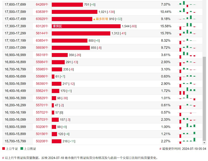 牛证街货重货区在17300-17399区间,该区间最新牛证数量为1544张,较上一交易日减少60张;最多新增在17400-17499区间,该区间最新牛证数量为910张,较上一交易日增加32张。