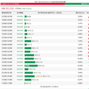 法兴恒指牛熊证街货分布图中的数据显示,熊证街货重货区在18300-18399区间,该区间最新熊证数量为604张,较上一交易日减少52张;最多新增在18000-18099区间,该区间最新牛证数量为461张,较上一交易日增加191张。