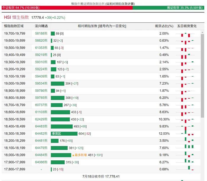 截至7月19日,恒指最新的牛熊街货比例为65:35。