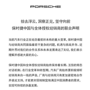 随着价格战的持续,经销商亏损不断加剧,而如果车企不采取措施,很有可能重蹈保时捷经销商“造反"的覆辙。此前,在曝出授权经销商集体“造反”后,保时捷迅速进行了安抚与处理,并发表了联合声明。