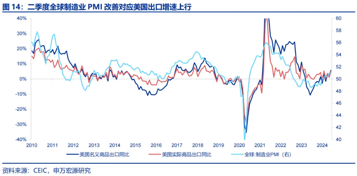 24Q2 美国净出口逆差扩大,主要反映二季度居民消费反弹。24Q2 美国实际净出口逆差 1.0 万亿美元,较 Q1 扩大 467 亿美元,对实际 GDP 拖累加大,主要反映的是二季度美国居民内需强势,完全掩盖住了美国设备投资复苏、工业生产改善对于出口的拉动。