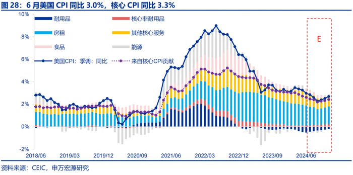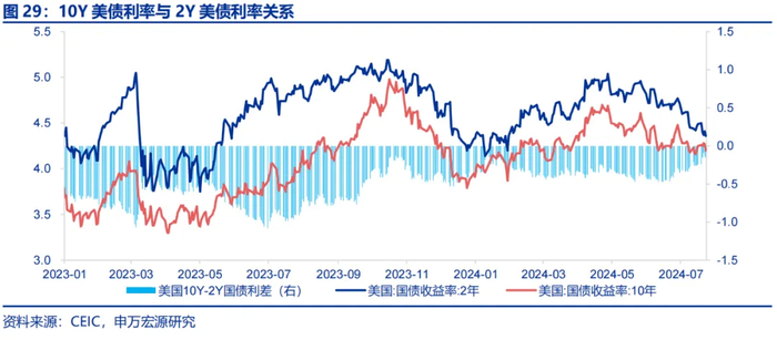 美联储 9 月 50BP 降息预期下降,短期经济陷入衰退的预期有所收敛,但市场对 9 月开启降息的预期依然较强。四季度需关注美国经济放缓+通胀下行遇阻组合的可能性。往后来看,四季度需更关注美国经济放缓,但同时 CPI 通胀粘性增强(核心非耐用品通胀+房租反弹+美联储降息)所形成的市场格局转变,同时下半年美国大选风险也将体现在对于金融市场的预期冲击上。