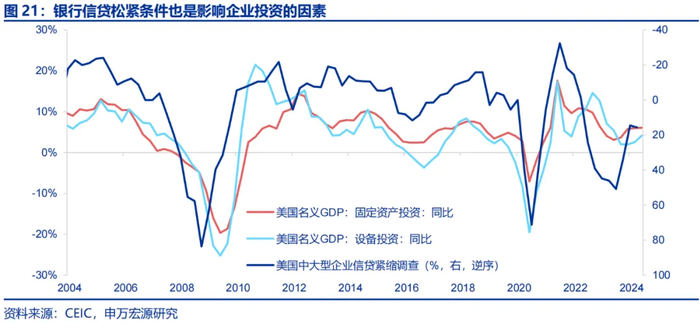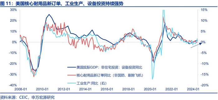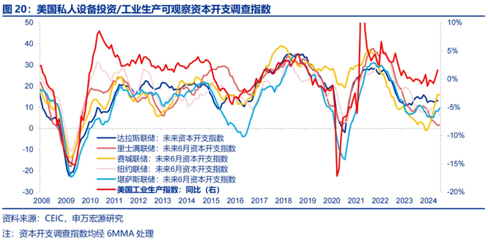 补库拉动+前期建筑投资传导,非住宅投资进一步升温。24Q2非住宅投资年化环比5.2%,连续第三个季度环比升温,一方面美国今年进入补库周期,另一方面前期拜登政策刺激下的制造业建筑投资正逐步转化为设备投资。