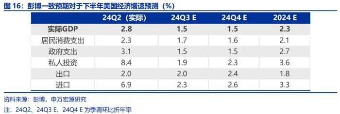 市场预期2024全年美国经济增速仍将达2.3%,二季度为全年高点,三、四季度经济内需放缓。市场怎么看美国下半年经济?彭博一致预期,市场预期美国2024年实际GDP增速将在2.3%,略低于去年的2.5%。从季度分布看,市场预期24Q3、24Q4预期增速为均为1.5%(年化环比),也就是说二季度美国实际GDP增速为全年高点。GDP分结构来看,市场预测下半年居民消费、政府投资、私人投资、进口环比均将弱于24Q2,而美国出口增速在24Q4或进一步提升。
