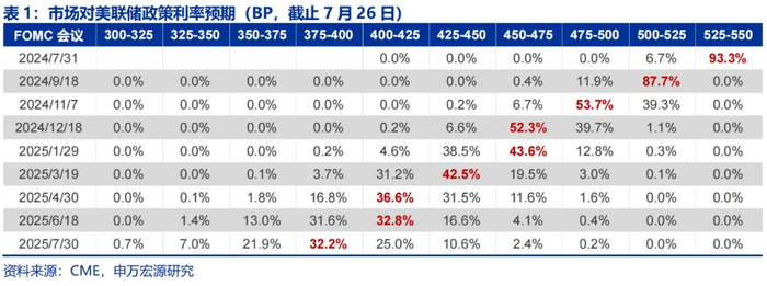 美联储9月50BP降息预期下降,短期经济陷入衰退的预期有所收敛。2024年以来,市场对美国经济及美联储降息预期波动呈现“钟摆式”波动,一季度在美国通胀超预期强劲、美国经济“不着陆”预期影响下,10Y美债利率飙升至4.7%,而二季度一系列较弱的经济数据、通胀数据使得市场对于前期预期进行修正,直至开始担忧美国经济是否会快速进入衰退的风险。此次美国二季度GDP数据一定程度上打消了这部分担忧,市场据此下调了对9月会议50BP降息的预期,但对9月开启降息的预期依然较强(通胀回落+GDP韧性的软着陆组合)。