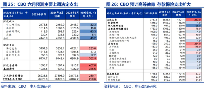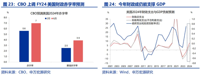 下半年美国财政或仍有支撑。6月,美国国会预算办公室(CBO)上调美国2024财年赤字预测,预计2024财年美国赤字率将达到7%,较2月的预测值提高1.4个百分点。拆解收支分项可以发现,大选年,拜登政府扩大医保参保规模、推出学生贷款减免计划、增加对外援助支出等,是今年美国赤字上涨的主要原因。展望下半年,4月,拜登政府对外援助法案通过;7月,学生贷款减免开始执行,后续财政支出规模或将进一步扩大。全年财政支出增速或超出去年水平,财政支出增速上涨或将有助于支撑GDP增长。