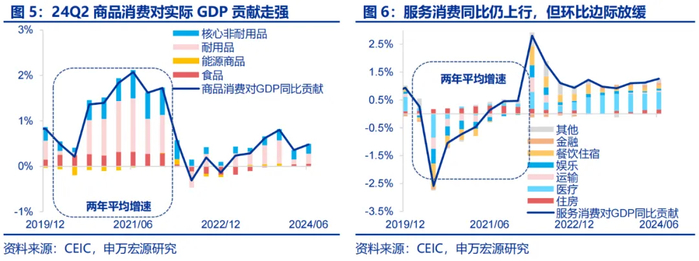 24Q2美国居民消费走强,主要因素为商品消费年化环比在Q1的-2.3%后大幅反弹至2.5%,但Q2整体居民实际消费年化环比(2.3%)仍弱于2023年平均2.8%,也就是说二季度美国消费的确强于一季度,但仍未超出去年的水平。