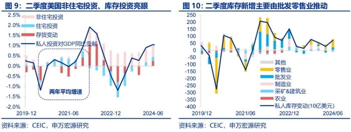 24Q2美国私人库存新增713亿美元,从行业来看主要为批发业、零售业推动,对应美国商品消费韧性犹在,在居民就业、消费未来面临更多压力的情况下,此轮补库存力度无法与上一轮相提并论。