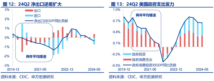 补库、非住宅投资加速恢复,住宅投资受高利率冲击。2024Q2美国私人库存新增713亿美元,从行业来看主要为批发业、零售业推动,对应美国商品消费韧性犹在。补库拉动+前期建筑投资传导,24Q2非住宅投资年化环比5.2%,连续第三个季度环比升温,地产投资环比降温,主要反映前期高利率。内需恢复致贸易逆差扩大,政府支出发力托底经济。