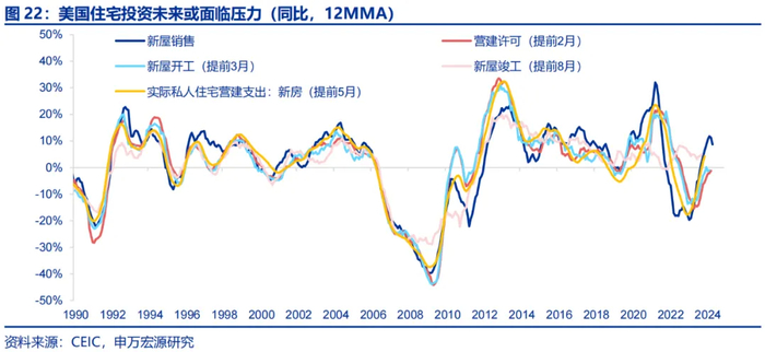 地产投资环比降温,主要反映前期高利率。今年一季度美债利率的冲高,导致二季度美国实际住宅投资年化环比仅-1.4%(一季度为16%),根据其与新屋销售增速的滞后关系来看,未来1-2个季度地产投资可能会进一步降温,而近期美债利率回落可能对于地产投资的刺激传导至少要等到今年年末。