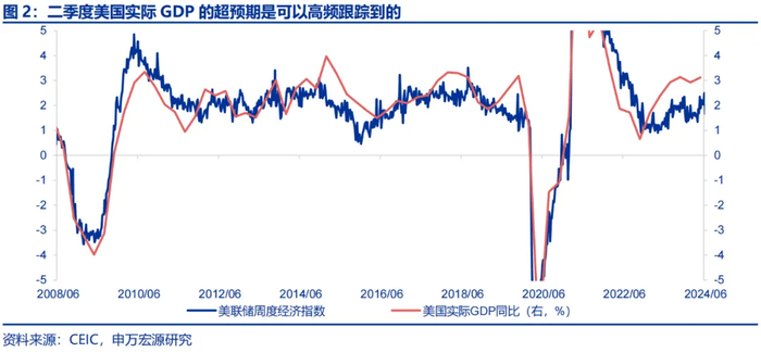 2024Q2美国实际GDP年化环比2.8%,远超市场预期的2.0%。二季度GDP环比强劲的主要单项来自于居民消费,其次为非住宅投资、政府投资、补库三大投资支撑经济。财富效应或可部分解释居民商品消费走强。美国二季度市场对美联储降息预期大幅提升,股市上涨,美联储金融状况指数也更转为宽松。
