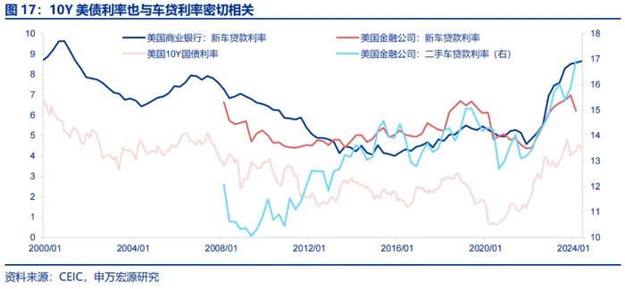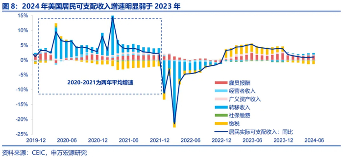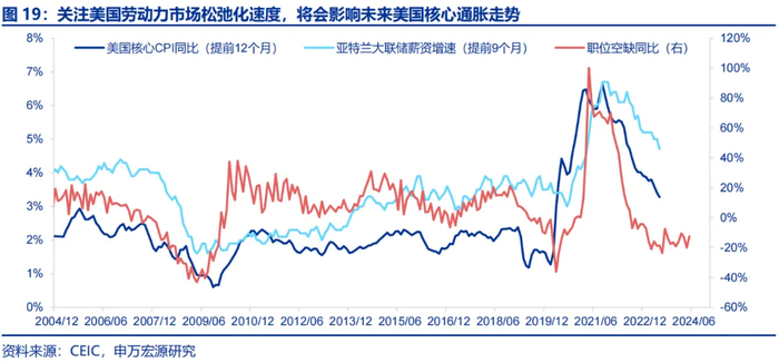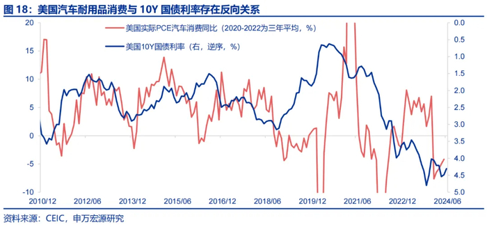 下半年美国居民消费趋势仍为降温,后续需关注劳动力市场进展及市场利率变化。我们认为,随着美国就业市场转冷、薪资增速回落,以及税收缴纳拖累,2024年美国居民收人或持续拖累居民消费,进一步叠加消费信贷恶化、储蓄消耗等因素,未来美国整体居民消费所面临的周期性压力或更大。从决定消费的逻辑上来看,1)一方面需要跟踪劳动力市场松弛化程度,诸如职位空缺、薪资增速等指标,这通过居民薪资收人预期影响消费;2)另一方面,由于美国耐用品消费更凸显“利率”敏感的特质,这一点在此次二季度数据已经有所体现,若美联储9月开启降息,则可能部分消费有所提振。