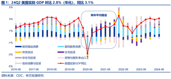 当地时间7月25日,美国BEA公布24Q2美国实际GDP数据,年化环比2.8%,市场预期2.0%,同比3.1%,远超市场预期。从结构来看,二季度GDP环比强劲的主要单项来自于居民消费,其次为非住宅投资、政府投资、补库三大投资支撑经济。数据公布之后美债利率、美元指数上行,显示市场对美国经济信心增强。从数据来看,居民消费、非住宅投资、政府投资消费环比分别由一季度的1.5%、4.4%、1.8%提升至2.3%、5.2%、3.1%(年化环比),Q2私人库存新增713亿美元,上季度仅新增286亿美元。