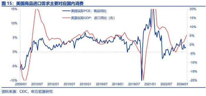 二季度美国进口环比增速冲高,实为受到居民商品消费反弹拉动,后续若美国居民消费增速放缓,则进口增速将出现同样趋势,这一点也体现在市场预测中。