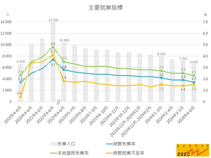 与今年3月至5月比较,澳门4月至6月总体失业率(1.7%)及澳门本地居民失业率(2.3%)均下跌0.2个百分点,就业不足率(1.5%)则微升0.1个百分点。居澳劳动人口共38.30万人;就业人口(37.64万人)及澳门本地就业居民(28.70万人)分别增加4300人及3400人。失业人数(6600人)减少600人,已连续六期下跌,并与2019年同期相似。寻找新工作的失业人口中,以失业前从事博彩业和零售业的占多。另一方面,寻找第一份工的新增劳动力占总失业人口比重上升1.8个百分点至8.0%。