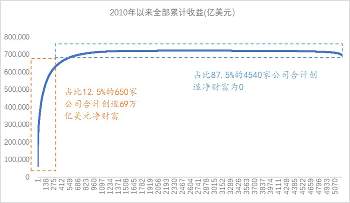 2010年至今美股占比12.5%的650家公司合计创造69万亿美元净财富(股价上涨的价差收益加上分红),占比87.5%的4540家公司合计创造净财富为0。2010年以来美股全部累计收益(亿美元)