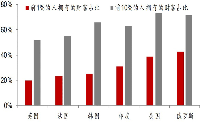 在现实世界中,分化不仅体现在行业和企业部门,还体现在居民部门内部的贫富差距不断扩大,一国不同地域之间的差距扩大你,乃至国家之间的差距扩大。这种分化达到某种高度,则可能就会导致内乱或外战。一些国家1%和10%居民持有的财富占比