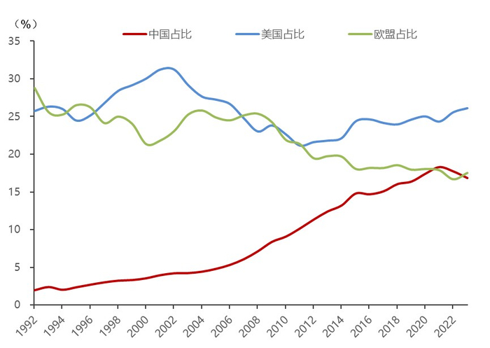 当美国的钢铁之城、汽车之城开始衰落的时候,70年代的日本制造业开始崛起,80年代的亚洲四小龙制造业开始崛起,90年代的中国制造业开始崛起,这就是所谓的全球性产业转移。尽管美国的重工业早已今不如昔了,但美国的高科技产业却在全球遥遥领先,服务业贡献了了美国总就业人口的84%。2021年以后,美国GDP占全球的份额连续两年上升,比2021年上升差不多两个百分点。因此,川普的“Make America Great Again”,实际上有误导选民之嫌,本质是为了获得锈带州的更多选票而已。三大经济体GDP占世界比重(美元,%)