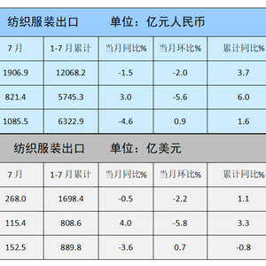8月7日,中国纺织品进出口商会消息,海关总署最新数据显示,7月纺织服装出口在基数较低的情况下出现超预期下降。按美元计,当月纺织服装出口额268亿美元,同比由正转负,下降0.5%。出口负增长主要受服装出口下降拖累,服装当月出口同比下降3.6%,纺织品出口同比增长4%。初步分析,服装出口下降的主要原因是出口价格下跌迅速。二季度,服装出口价格整体下跌了9.3%,下跌趋势进一步延续到三季度。1-7月,纺织服装累计出口同比增长1.1%,其中纺织品出口增长3.3%,服装出口下降0.8%。