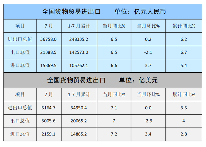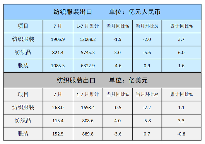 2024年1-7月,纺织服装累计出口12068.2亿元,比去年同期(下同)增长3.7%,其中纺织品出口5745.3亿元,增长6%,服装出口6322.9亿元,增长1.6%。7月,纺织服装出口1906.9亿元,同比下降1.5%,环比下降2%,其中纺织品出口821.4亿元,同比增长3%,环比下降5.6%,服装出口1085.5亿元,同比下降4.6%,环比增长0.9%。