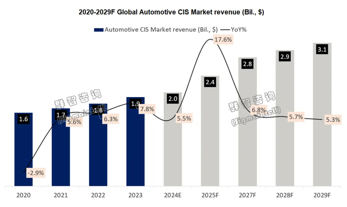 主动安全及智能驾驶渗透,预计2024年全球汽车图像传感器(CIS)的市场规模约20亿美金,同比增长约5.5%。