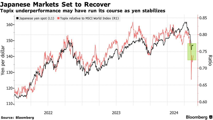 目前,随着日本央行副行长内田真一发表声明安抚市场情绪,强调在市场不稳定的情况下,日本央行不会选择继续提高政策利率,日元汇率全面下行。日本央行的政策制定者以及日本政府近期迅速向市场保证,至少短期内进一步加息的可能性已经排除,这也影响了日本股市,日元贬值促使外资继续流入日本市场,推动日本股市彻底收复“黑色星期一”所触发的全部跌幅。