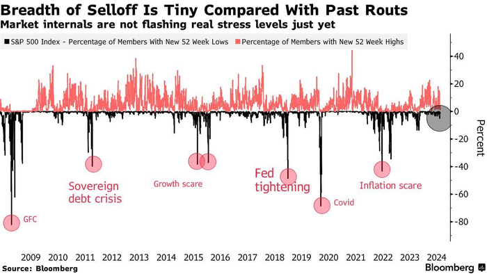 根据机构汇编的数据,在下跌最深的时候,标普500指数中仅仅约5%的成分股跌至一年低点。这意味着此次下跌的范围比之前由重大宏观经济变化或者重大黑天鹅事件所引发的下跌幅度要小得多。在通胀飙升推动美联储在2022年开启激进加息周期后,该指数曾经有接近一半的成分股跌至12个月低点。此外,新冠疫情期间这一比例上升至大约三分之二。