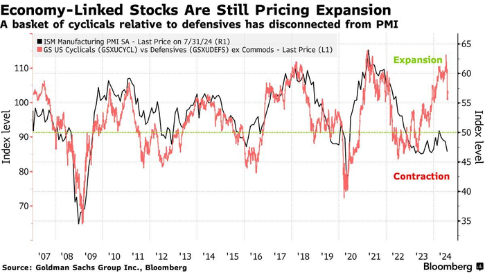 华尔街大行高盛编制的一篮子股票指数显示,虽然周期股最近表现落后于防御股,意味着市场仍在定价“美国经济衰退”这一悲观预期,但好的一面在于它们的交易价格仍基于经济扩张预期。