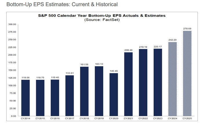 盈利预期上修也将是推动美股持续上行的重要推力。FactSet Research汇编的华尔街分析师预期数据显示,对于2024年第四季度,分析师们普遍预计标普500指数成分公司整体每股收益(EPS)将增长15.7%,营收规模将增长5.4%。对于整个2025年,分析师们预计标普500指数每股收益将增长15.2%,营收有望增长6.0%。