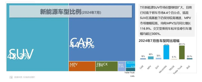 2024年7月,新能源轿车占比44.0%,比去年同期下滑3.0个百分点。新能源SUV份额达到48.3%,份额同比增长2.1个百分点,占比继续扩大。7月新能源SUV市场份额继续扩大,目前已经高于轿车市场4.4个百分点,插混SUV在高基数下仍保持较高增速,MPV市场增幅较高,纯电MPV当月同比增长116.9%。交叉型乘用车和半挂牵引车增幅均超过300%。