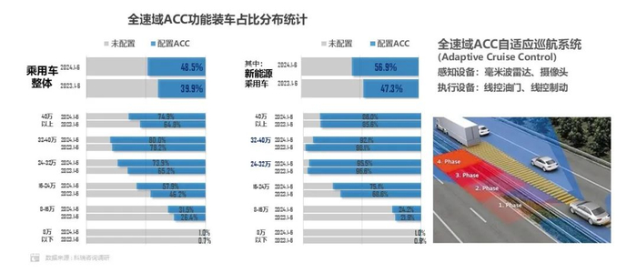 全速域ACC自适应巡航是ADAS中的一项核心功能,通过雷达或激光雷达来监测前车的距离和速度,自动调整车速以保持安全距离。由于技术较为成熟,目前新能源乘用车市场装车率超过55%,其中24万以上车型装车率均在80%以上,也有车型将全速域ACC自适应巡航设为选配,低配车型仅搭载定速巡航。一定程度上降低了整体装车率。