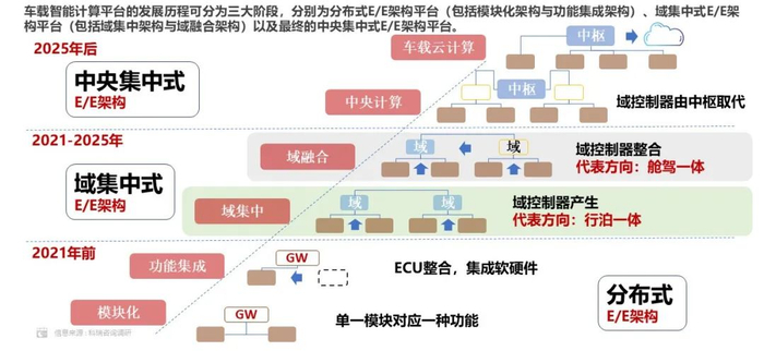 车载智能计算平台的发展历程可分为三大阶段,分别为分布式E/E架构平台(包括模块化架构与功能集成架构)、域集中式E/E架构平台(包括域集中架构与域融合架构)以及最终的中央集中式E/E架构平台。当前整车架构正在向中央集中式发展。
