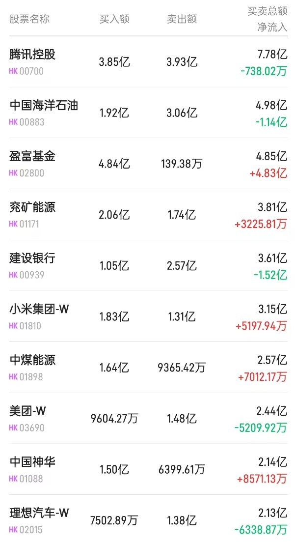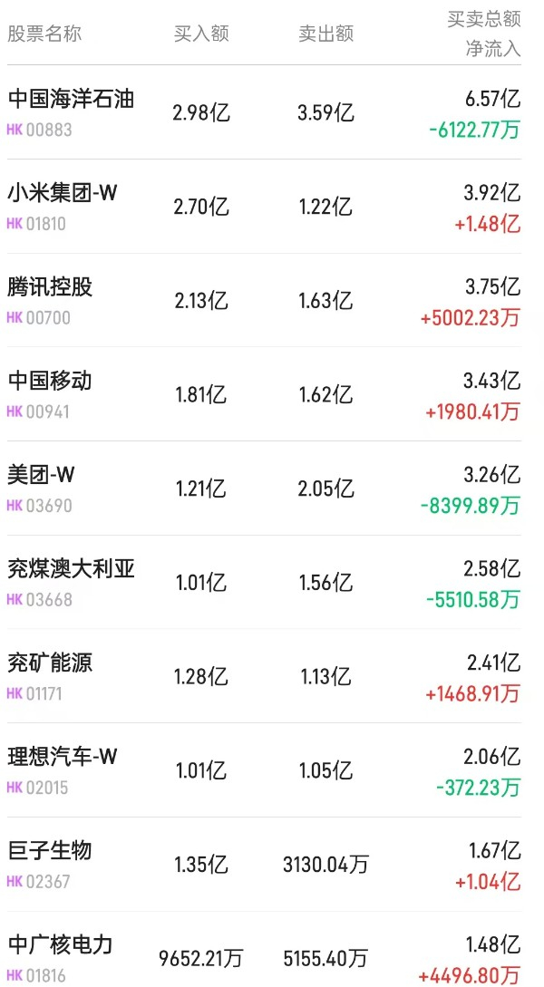 此外,小米集团-W(01810)、中国移动(00941)分别获净买入1.99亿、1980万港元。而建设银行(00939)遭净卖出1.52亿港元。