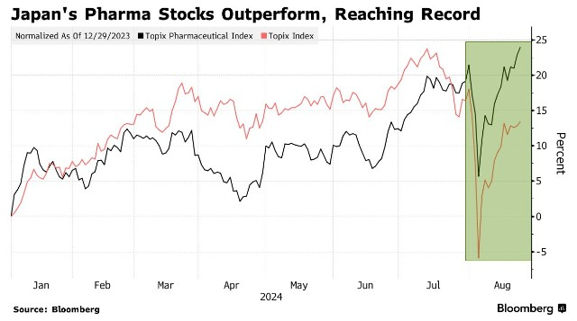如果投资者对日本股市和经济前景的担忧有所缓解,制药类股票可能会因迄今为止的上涨而面临抛售压力。三菱日联资产管理公司的 Ishigane 并不认为美国经济衰退是他的主要预测,但他仍预计制药类股票的受欢迎程度至少会持续半年左右。