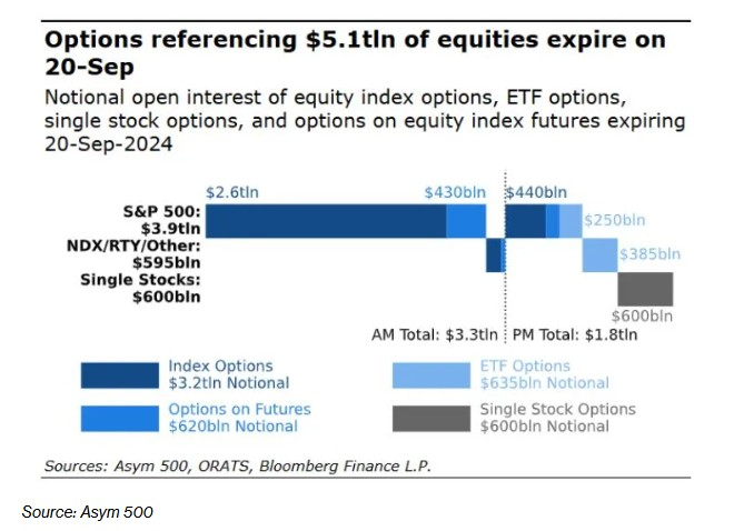 就在华尔街交易员开始应对美联储降息之际,周五美股“三巫日”可能会进一步搅动市场。据衍生品分析公司Asym 500估计,约5.1万亿美元的指数、股票和ETF期权将在周五到期。