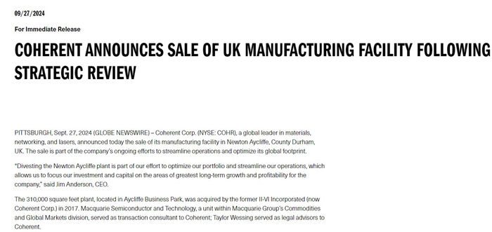 Coherent首席执行官JimAnderson表示,剥离NewtonAycliffe工厂是公司优化投资组合和简化运营努力的一部分,这使其能够将投资和资本集中在公司最长期增长和盈利能力的领域。