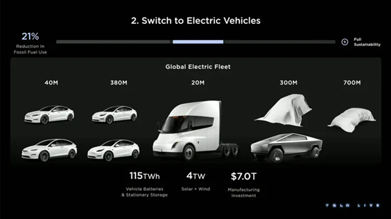 特斯拉当前产品线(Model S、X、3、Y、Tesla Semi和Cybertruck),其中还包括三辆被遮住的在研车型。
