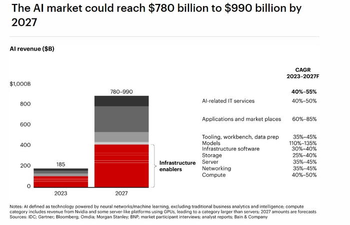 全球知名战略咨询公司贝恩预测,随着人工智能(AI)技术的迅速普及颠覆了企业和经济,人工智能相关的所有市场规模正在膨胀,到2027年将达到9900亿美元。这家咨询公司在周三发布的第五份年度《全球技术报告》中指出,包括人工智能相关服务和AI GPU等基础核心硬件在内的整体AI市场规模将在去年1850亿美元的基础上,每年增长40%至55%。这意味着,到2027年将带来7800亿至9900亿美元的庞大收入。