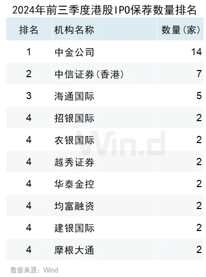 中金公司作为保荐人角色参与了14家IPO,位居榜首;中信证券(香港)保荐了7家IPO,位居第二名;海通国际保荐了5家IPO,位居第三名。