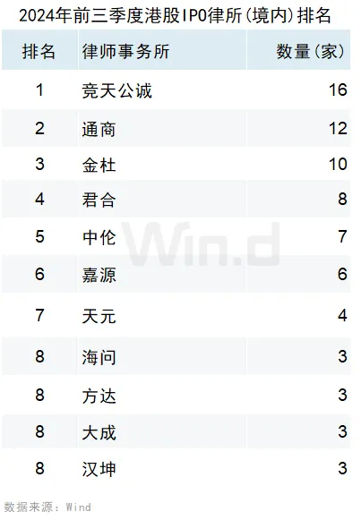 IPO律师(境内业务)方面,竞天公诚律师事务所参与了16家IPO,位列第一;通商律师事务所参与了12家IPO,位列第二;金杜律师事务所参与了10家IPO,位列第三。