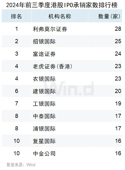 从IPO承销家数来看,利弗莫尔证券以担任28家IPO承销商位居榜首;招银国际以担任25家IPO承销商位居第二;富途证券以担任24家IPO承销商并列第三名。
