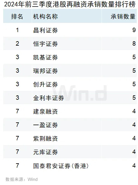 中金公司以59.93亿港元的再融资承销规模位列第一,承销数量3起;华泰金控以38.55亿港元的承销规模位列第二,承销数量3起;中信证券(香港)以33.68亿港元的承销规模位列第三,承销数量3起。
