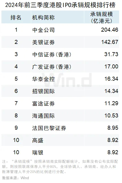2024年前三季度,从IPO承销金额来看,中金公司以204.46亿港元的承销金额遥遥领先,稳居IPO承销榜榜首,承销家数为16家;美银证券以142.67亿港元的承销金额位居第二,承销家数为1家。中信证券(香港)以31.73亿港元的承销金额紧随其后位居第三,承销家数为12家。