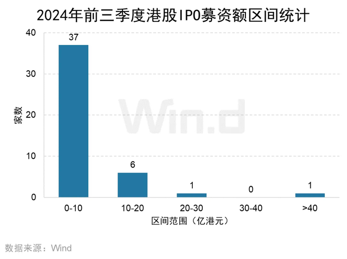 2024年前三季度港股IPO融资金额在10亿港元以下的数量最多,高达37家,占到IPO总数的82.22%;其次是募资金额在10-20亿港元的区间,家数为6家;仅1家IPO融资规模大于40亿港元。
