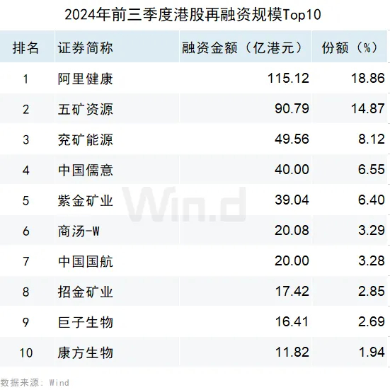 再融资募集金额最高的企业是阿里健康,募资金额达115.12亿港元,占2024年前三季度再融资总规模的18.86%;五矿资源以90.79亿港元的募资规模位居第二;兖矿能源以49.56亿港元的募资规模位居第三。