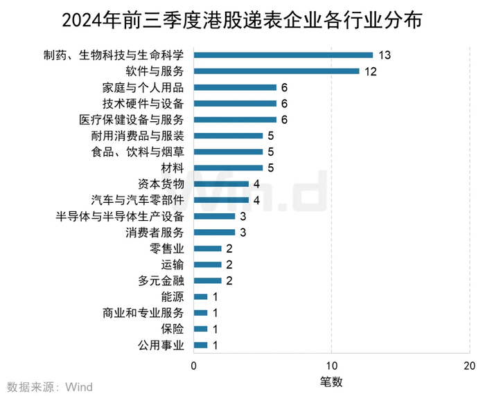 从各行业首次递交上市申请数量来看,2024年前三季度共有82家企业在香港交易所首次递交上市申请。其中,生物制药行业共有13家企业递表,位列第一;软件与服务行业共12家企业递表,位列第二;家庭与个人用品、技术硬件与设备以及医疗保健与服务行业共6家企业递表,并列第三名。