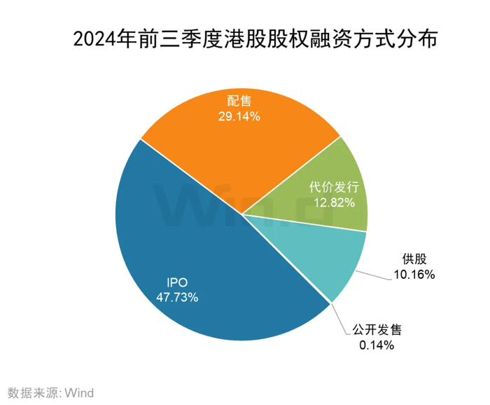从具体融资方式来看,2024年前三季度IPO募资金额为557.54亿港元,占总募集资金的47.73%;配售募集资金为340.39亿港元,占比达29.14%;代价发行募资金额为149.72亿港元,占比达12.82%。