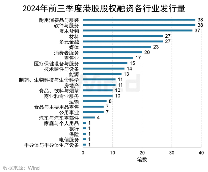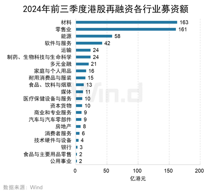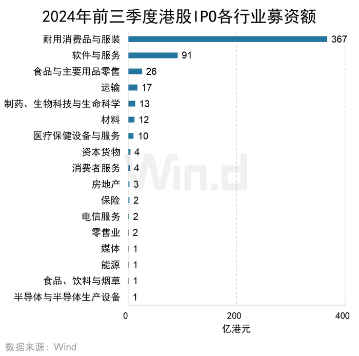 从各行业融资金额来看,耐用消费品与服装业、材料以及零售业三个行业在2024年前三季度融资金额位居前三,募集金额依次为382亿港元、175亿港元和162亿港元。