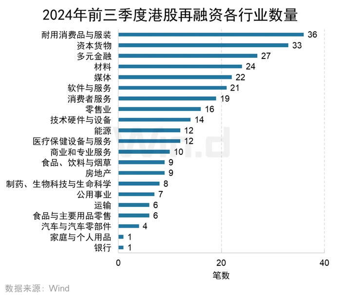 从各行业再融资数量来看,耐用消费品与服装行业的再融资项目数量为36起,位列第一;资本货物行业以33起位列第二;多元金融行业以27起位列第三。