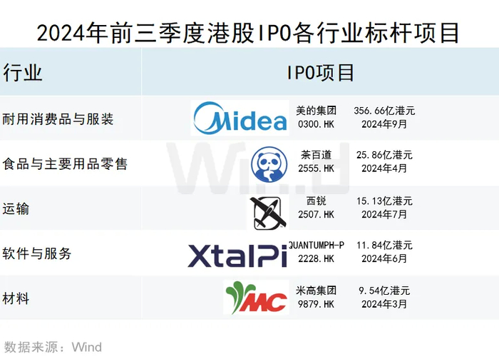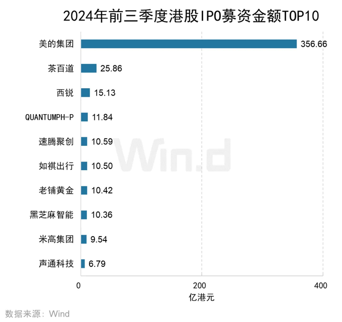 2024年前三季度,IPO募资金额最高的公司是美的集团,募集金额高达356.66亿港元;茶百道和西锐分别以25.86亿港元和15.13亿港元的募集金额位列第二名和第三名。前十大IPO项目共募集467.71亿港元,占全部IPO募资总额的83.89%。
